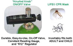 weighs only 8 pounds, smaller than a briefcase at 12"x12"x3", durable and almost waterproof, complete with LIFE-O2® 6&12 lpm "Norm & High" regulator of Emergency Oxygen in disposable/replaceable (or low-cost refillable) 113 liter cylinder, LIFE® CPR Mask fits adult/child; for Philips AED (OnSite or FRx) or Heartsine samaritan AED defibrillators for immediate easy first-aid oxygen administration, and if needed before fibrillation or after successful defibrillation.